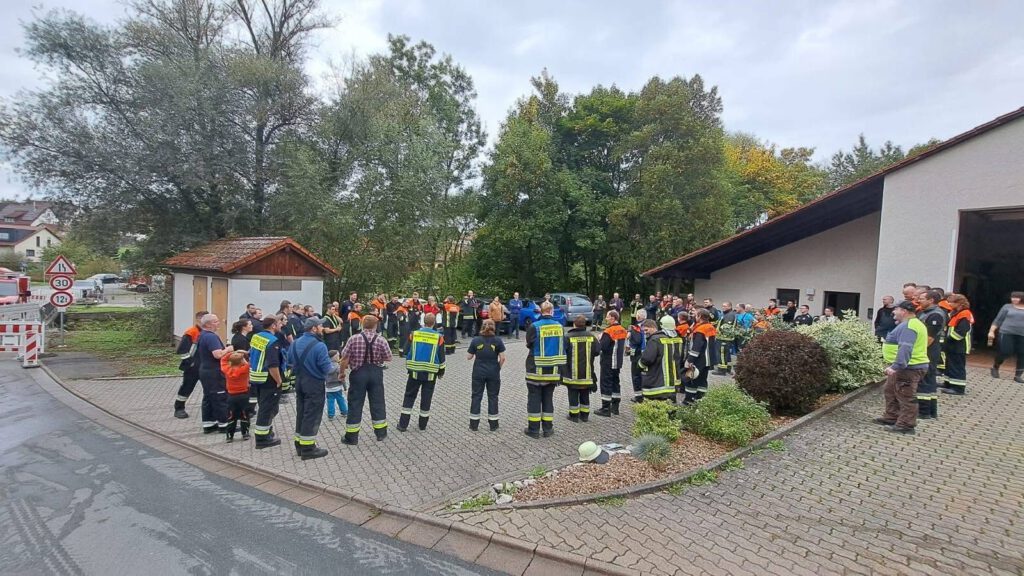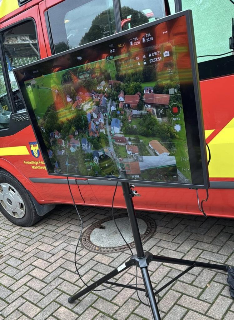 Am vergangenen Samstag unterstützen wir die Drohnengruppe der Feuerwehr Marktleugast bei einer großangelegten Übung im Rahmen der Feuerwehraktionswoche in Frankenberg bei Katschenreuth. Angenommen wurde ein Scheunenbrand im engen Ortskern von Frankenberg. Da in diesem Ort nicht genügend Löschwasser zur Verfügung steht, musste eine lange Förderleitung vom Main bis in die Ortsmitte errichtet werden. Ebenfalls wurde ein Faltbehälter für den Pendelverkehr mit Tanklöschfahrzeugen aufgestellt. Somit konnte ein Löschangriff mit mehreren C-Strahlrohren sowie über die Drehleiter der Stadt Kulmbach erfolgen.
